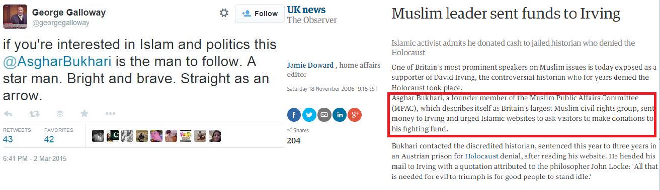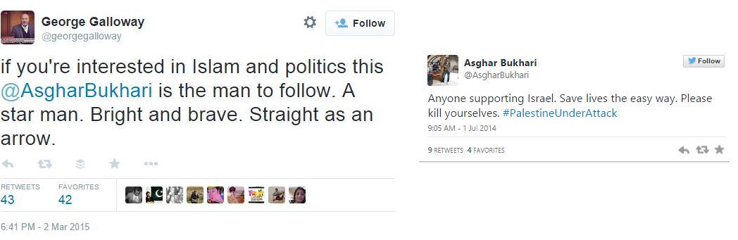 A tweet by Galloway on March 2nd expressed enthusiastic support for Asghar Bukhari, a founding member of the Muslim Public Affairs Committee UK (MPACUK), an organisation banned from university campuses in 2004 due to its promotion of antisemitism.